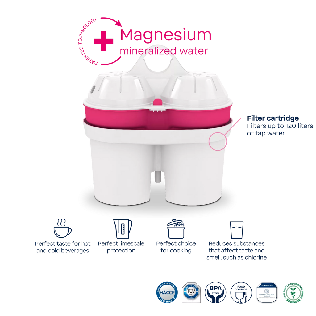 Filters limescale, chlorine, lead & copper + mineralizes water with magnesium.